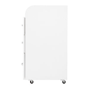 cabinet with 3 drawers on white roller guides. the cabinet has wheels installed, which allows it to be easily moved across the floor.