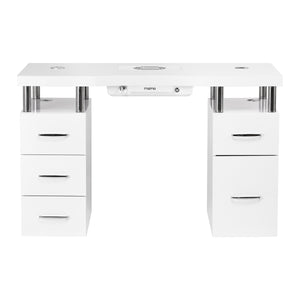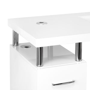 The desk is equipped with two functional cabinets with capacious drawers - there are three smaller ones on the left side and one smaller and one larger one on the right, ideal for appliances. The well-thought-out layout makes it easy to organise the workspace and provides quick access to the most necessary cosmetics and tools. Everything necessary is within easy reach, which promotes smooth and comfortable work. Additional open shelves above the drawers provide ideal space for equipment or frequently used utensils. The desk also features cable holes and grommets, which allow cables to be routed aesthetically and neatly, eliminating unnecessary chaos at the workstation.