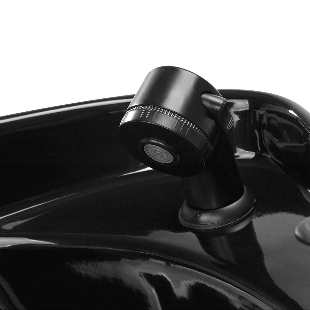 The black ceramic basin bowl with the appropriate depth prevents excessive splashing of water and products used during the treatment, allowing for comfortable performance of a wide range of services. The ability to adjust the angle of the bowl allows for adjusting the setting to individual needs. The material used makes the washbasin durable, resistant to stains and scratches, and very easy to clean. A properly profiled collar provides support and comfort during hair washing, and with the comfortable plastic cover, the customer will not feel the unpleasantness associated with the cold ceramic surface.