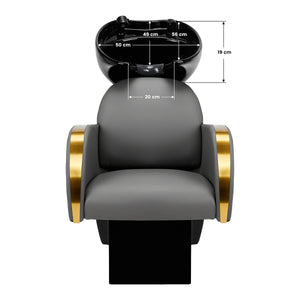 A properly profiled chair filled with durable foam ensures high comfort of use and elegant armrests allow for the correct positioning of the client's shoulders. The backrest is placed at an optimal angle to allow you to take the right position and promote excellent spine support. Coverage in shades of grey and decorative metal surfaces lacquered in gold colors give it a timeless elegance and in addition guarantees long-term durability and ease of cleaning. Distinctive hair wash unit classic finish makes it look great in almost any space. The set includes complete fittings in shades of black, including a faucet, shower head and dedicated hoses to provide a complete set of tools for work.