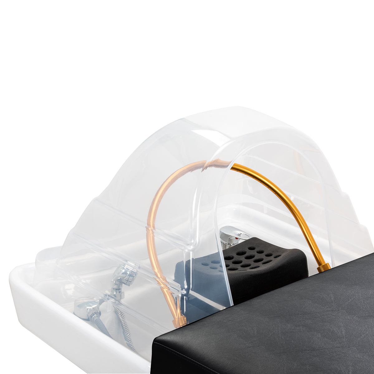A special arch with an adjustable inclination creates a waterfall effect that intensively cleanses the scalp and acts as a natural massage, improving blood circulation, reducing tension and stress. Precisely controlled water flow promotes hair regeneration and intensely moisturises the skin. The adjustable waterfall provides a deep cleansing of the scalp and relaxation, providing relief from ailments such as headaches and neck stiffness. Thanks to an intelligent closed-loop system, the arch draws water from the basin and reuses it, providing a continuous water massage.