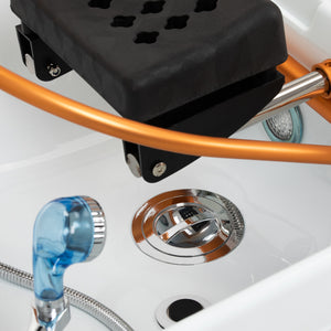 The golden arch with an adjustable inclination angle, designed for the Waterfall Head SPA, is an innovative solution that enables comprehensive scalp care. Water jets act as a natural massage, improving blood circulation, reducing tension and stress, and bringing relief from ailments such as headaches and neck stiffness. Precisely controlled water flow promotes hair regeneration and intensely moisturises the skin. Thanks to an intelligent closed-loop system, the arch draws water from the basin and reuses it, providing a continuous water massage. A combination of technology and relaxation that supports hair health and well-being