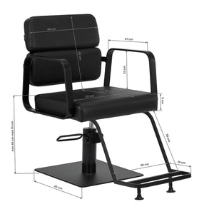 The full rotation mechanism of the chair makes the hairdresser's work more effective and comfortable. A solid, flat, square-shaped base guarantees stability during use. The matte-finished, smooth surface gives the element an elegant look and makes it easy to keep clean. A comfortable seat with foam filling ensures high comfort of use, even during many hours of treatments. Geometric, metal armrests allow for the correct positioning of the client's shoulders – this means that he does not bury his head in his shoulders or slouch – which makes it much easier to perform precise treatments, including haircuts. A stylish footrest dedicated to this model provides stable support for the user's feet.