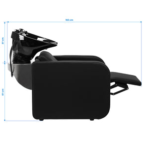The depth of the ceramic washbasin bowl in shades of black allows for comfortable and efficient performance of a wide range of hairdressing services, preventing excessive splashing of water and products used during the treatment. The material used makes the washbasin durable, resistant to discoloration and scratches, and very easy to keep clean. The appropriately profiled collar and inclined backrest provide support and comfort while washing hair, and thanks to the comfortable plastic overlay in shades of black, the client will not feel discomfort from the cold ceramic surface.