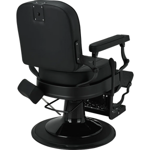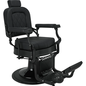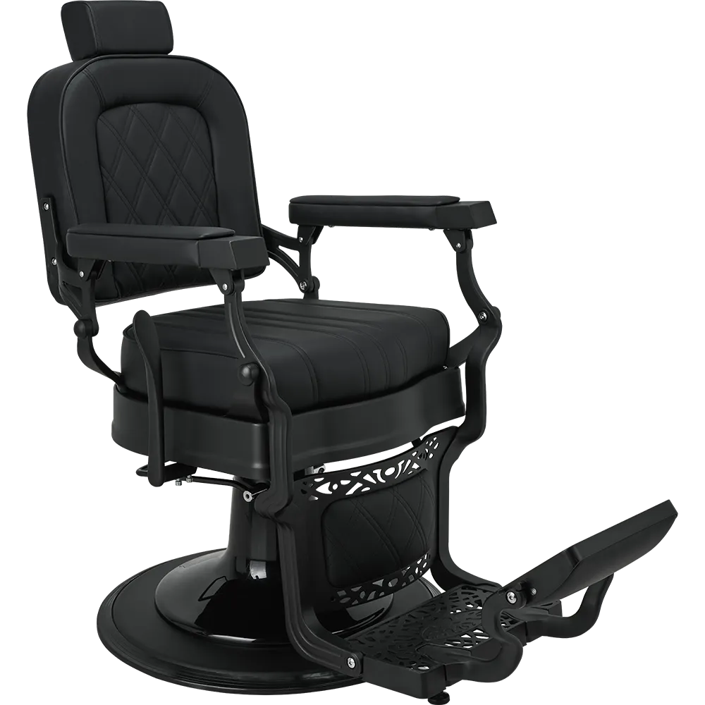 LOUIS barber chair Retro style with a modern twist. A solid metal frame with decorative detailing, black upholstery with quilted backrest and seat. The ergonomic backrest, adjustable headrest, and swiveled footrest provide maximum comfort for both work and client relaxation. An excellent choice for salons with character. Black upholstery