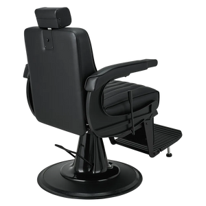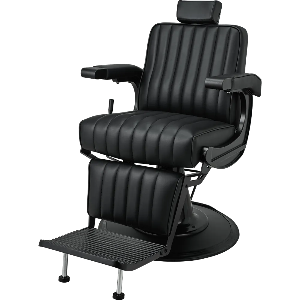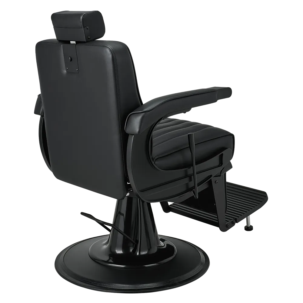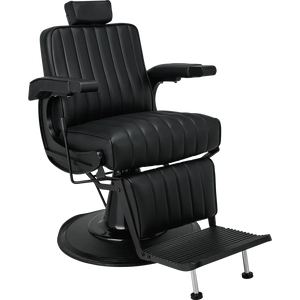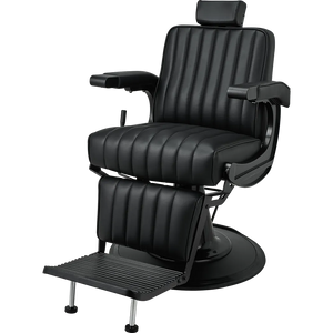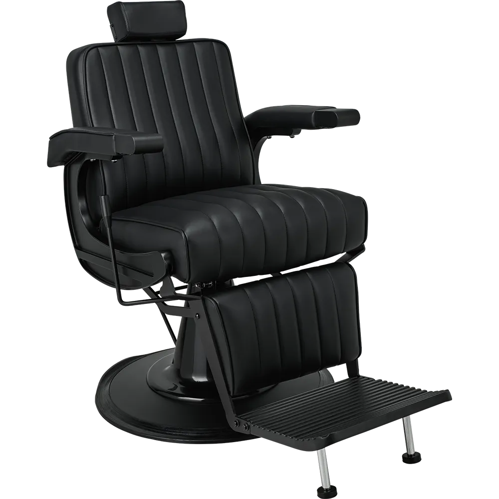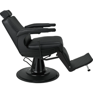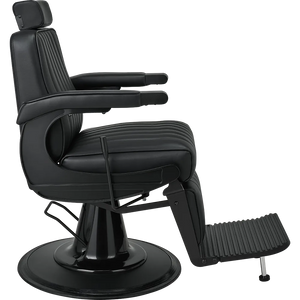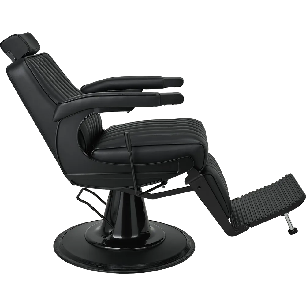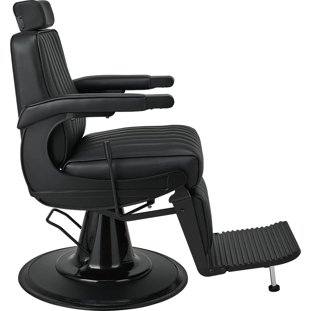 The perfect chair for the modern barber. Featuring black upholstery with vertical stitching, a matte black metal frame, adjustable headrest, reclining mechanism, and an upholstered legrest. Black upholstery with vertical stitching