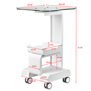 functional, metal and glass table with rubber wheels with a blocking function. Perfect as a table for a cosmetic device. it has a stable shelf for the device and another shelf for accessories, and thanks to the wheel, the table is mobile and easy to move. the piece of furniture provides convenience and comfort during work.