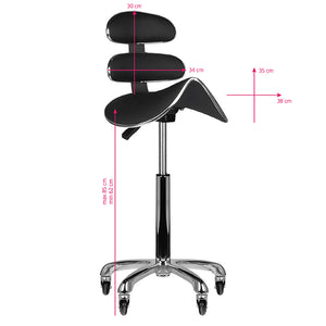 comfortable, stable cosmetic / hairdressing stool with a contoured seat and ergonomic backrest. mounted on a five-star base with sensational rubber and ball-bearing roll speed wheels that guarantee ease of movement. made of eco-leather in black color.