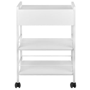 aesthetic and functional metal and wooden table by Giovanni, with one wooden drawer locked with a key and two wooden shelves. the upper part of the drawer also serves as a shelf. the table has four wheels. table available in white.