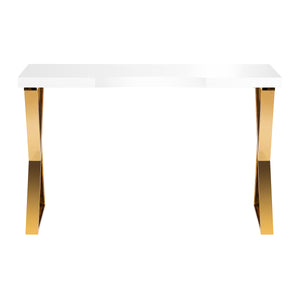 The high-gloss white top and geometric, golden legs give it lightness and a modern character. Thanks to its light form, the desk will work well in both intimate and spacious interiors, emphasizing their exclusive character. It is an excellent investment in aesthetics and comfort of daily work.
