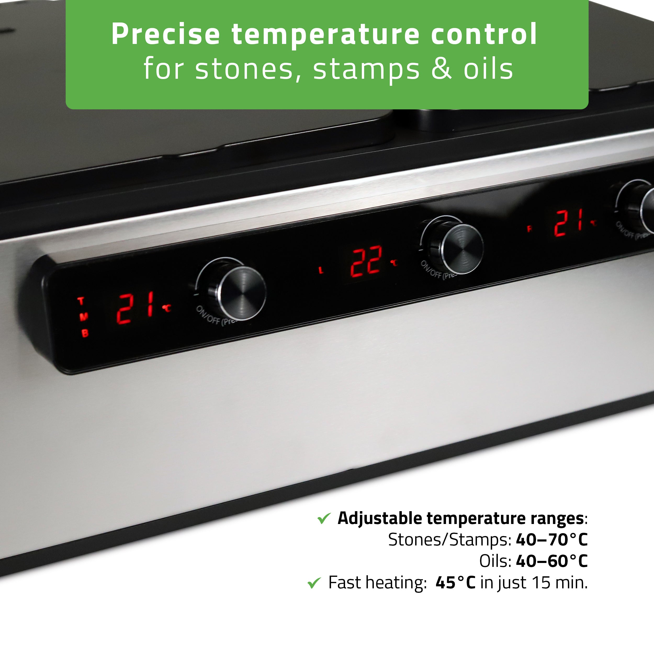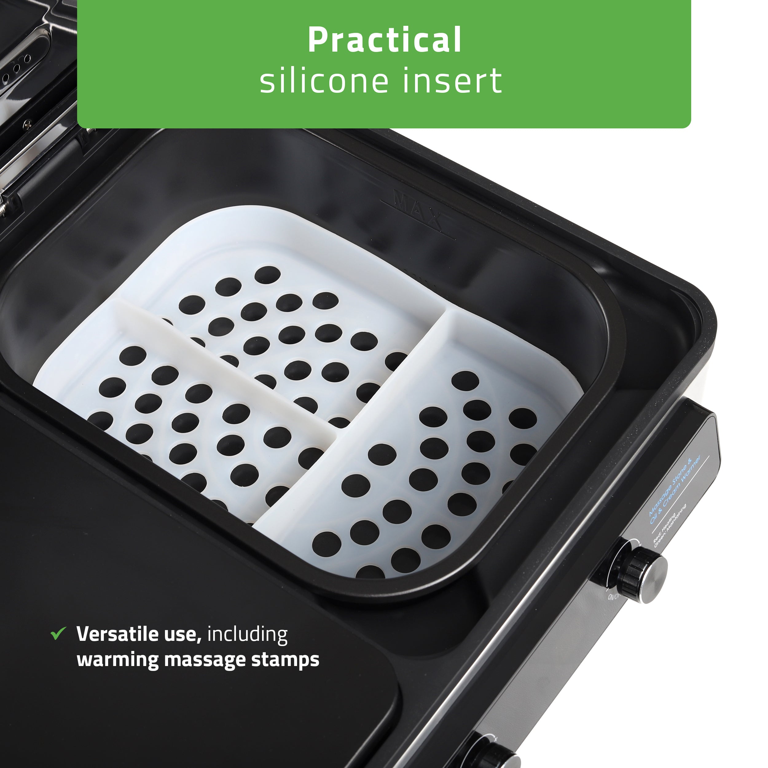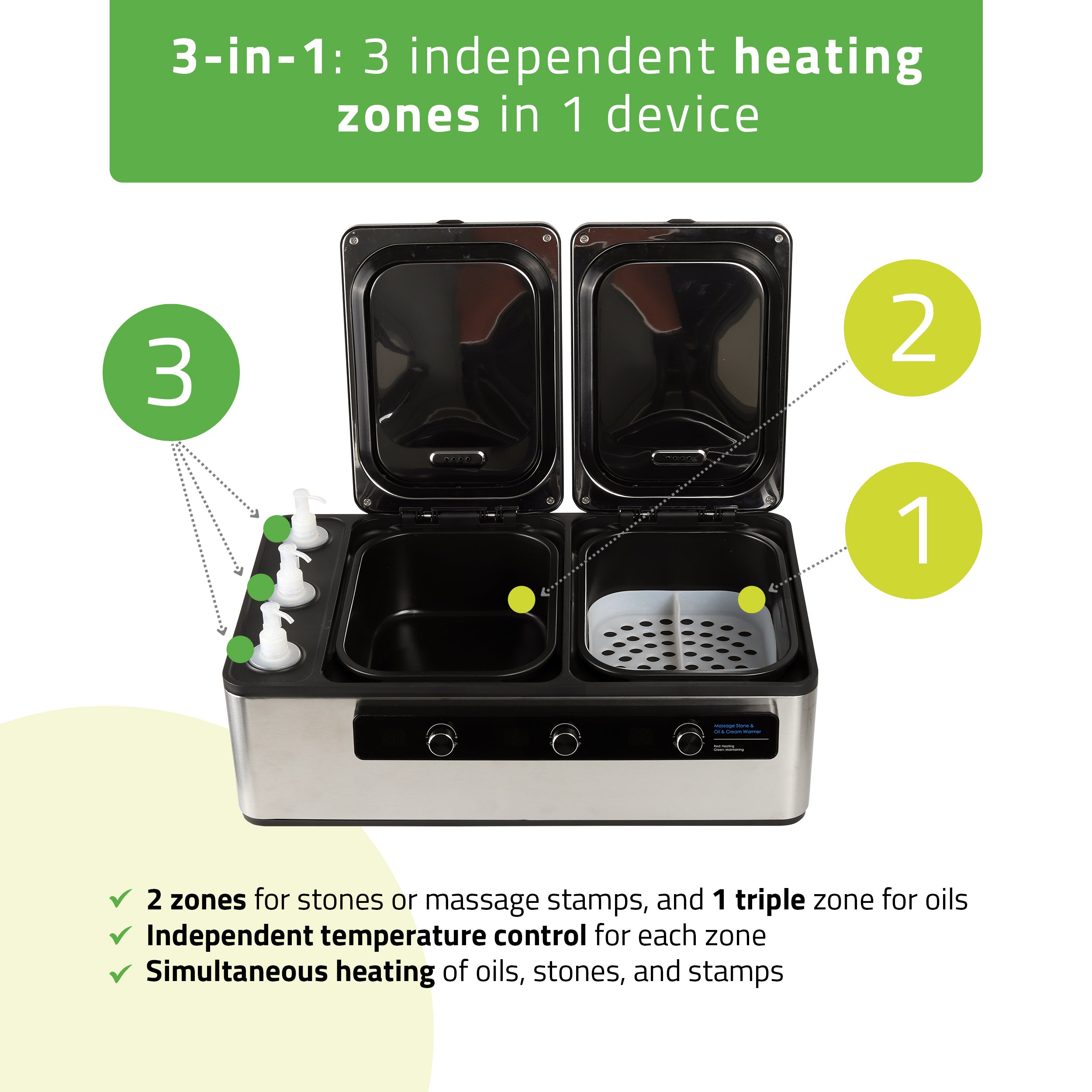 The multifunctional stone and oil heater is designed for professional massage studios, beauty salons, and spas. It provides excellent support for comprehensive relaxation and therapeutic treatments.
