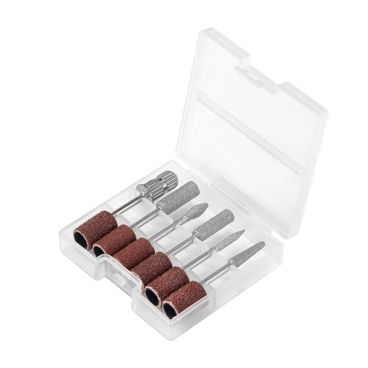 The set includes: nail drill base, h0ead, plastic head holder, cone bit, head cable, power supply, instructions.