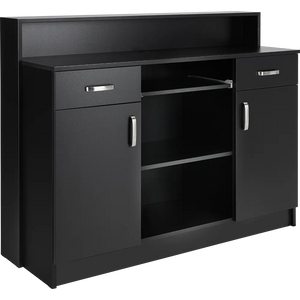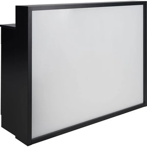 BRILL is a stylish and practical reception desk for hair and beauty salons, designed with contemporary interiors in mind. The illuminated front made of milky acrylic gives the furniture a light, elegant appearance that doesn’t overwhelm the space – even in smaller salons. The raised front panel creates a convenient top section above the work surface, offering additional space for storing everyday accessories. It’s the perfect choice for salons looking for a reception desk that is both universally stylish and fully adaptable to their functional and aesthetic needs. Made of black laminated board