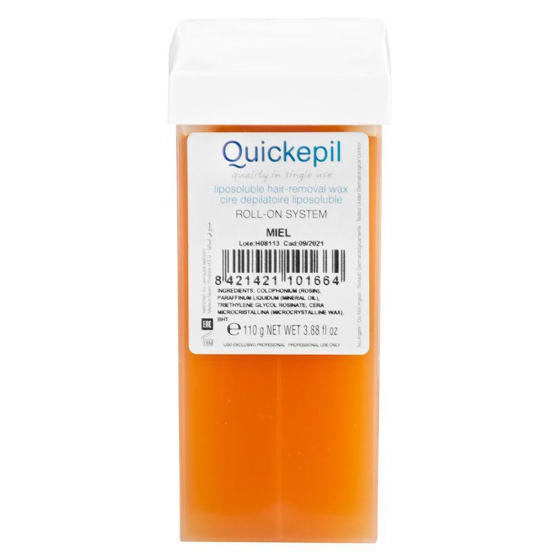 quickepil roll wax -on is specially designed for beauticians who are looking for great results. thanks to a special recipe, the roller stretches the wax into much thinner strips, which causes it to cool down almost immediately, minimizing baking. the product is then easily removed by strips. universal wax for all skin types, based on beeswax.