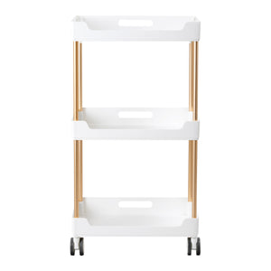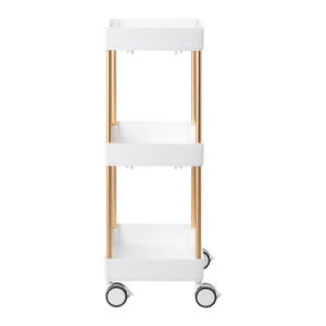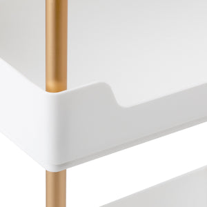 The white plastic shelves combined with copper-coloured metal tubes create a modern, aesthetically pleasing unit that is easy to keep clean. Handles on each shelf make it easy to move and provide a firm grip. The helper is equipped with four lockable wheels, which guarantees mobility and convenient organisation of the space. Solid materials affect the durability of the furniture and the comfort of use.