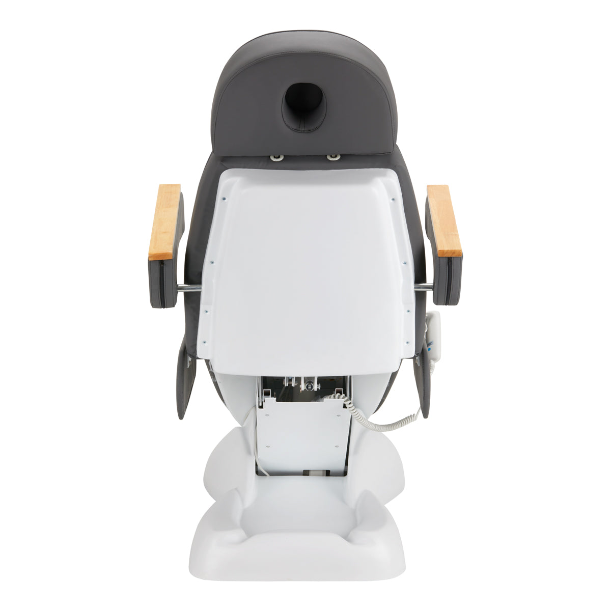 The chair is filled with foam of appropriate hardness and covered with pleasant-to-the-touch imitation leather in shades of grey. Thanks to the use of a material that is easy to keep clean and resistant to selected disinfectants, the equipment is comfortable to use, resistant to moisture and easy to clean. A solid base made of durable material in shades of whiteensures stability during treatments. Decorative wooden elements on the armrests distinguish the chair from other models, being a visually appealing, elegant accent. Properly profiled hems give the chair a stylish look and make the seat ergonomic.