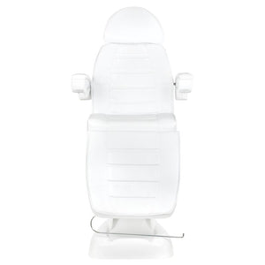 The armchair is filled with foam of appropriate firmness, and its surface is covered with a pleasant-to-the-touch imitation leather in shades of white. The covering material is easy to keep clean and resistant to selected disinfectants, which guarantees comfort of use and durability against moisture. A solid base made of durable material in shades of white ensures stability during treatments. Carefully contoured ergonomic hems give the chair a stylish look while providing comfort.