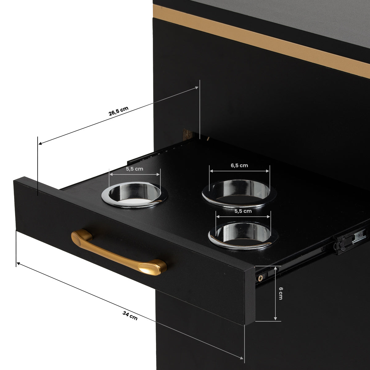 The Gabbiano 2027G hairdresser's helper is an elegant piece of equipment which will emphasise the character of a professional interior and improve everyday work organisation. The furniture is distinguished by a minimalist form in shades of black with gold details, which gives it a unique, luxurious look.