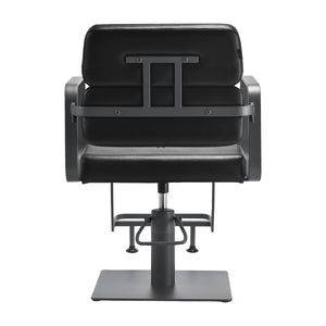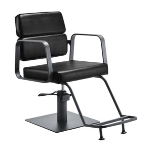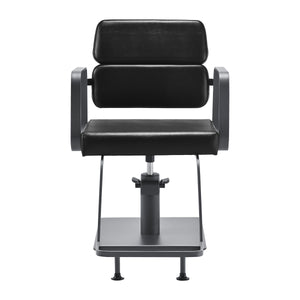 The full rotation mechanism of the chair makes the hairdresser's work more effective and comfortable. A solid, flat, square-shaped base guarantees stability during use. The matte-finished, smooth surface gives the element an elegant look and makes it easy to keep clean. A comfortable seat with foam filling ensures high comfort of use, even during many hours of treatments. Geometric, metal armrests allow for the correct positioning of the client's shoulders – this means that he does not bury his head in his shoulders or slouch – which makes it much easier to perform precise treatments, including haircuts. A stylish footrest dedicated to this model provides stable support for the user's feet.