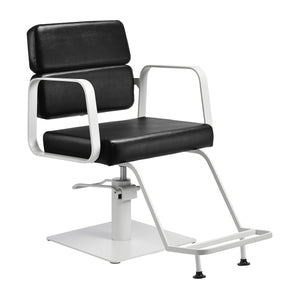 The full rotation mechanism of the chair makes the hairdresser's work more effective and comfortable. A solid, flat, square-shaped base guarantees stability during use. The matte-finished, smooth surface gives the element an elegant look and makes it easy to keep clean. A comfortable seat with foam filling ensures high comfort of use, even during many hours of treatments. Geometric, metal armrests allow for the correct positioning of the client's shoulders – this means that he does not bury his head in his shoulders or slouch – which makes it much easier to perform precise treatments, including haircuts. A stylish footrest dedicated to this model provides stable support for the user's feet.