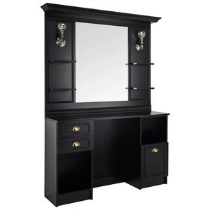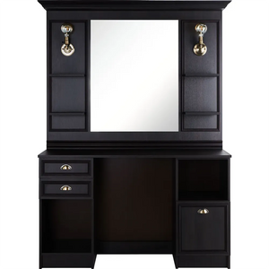 Equipped with shelves for cosmetics, an open and closed cabinet and drawers