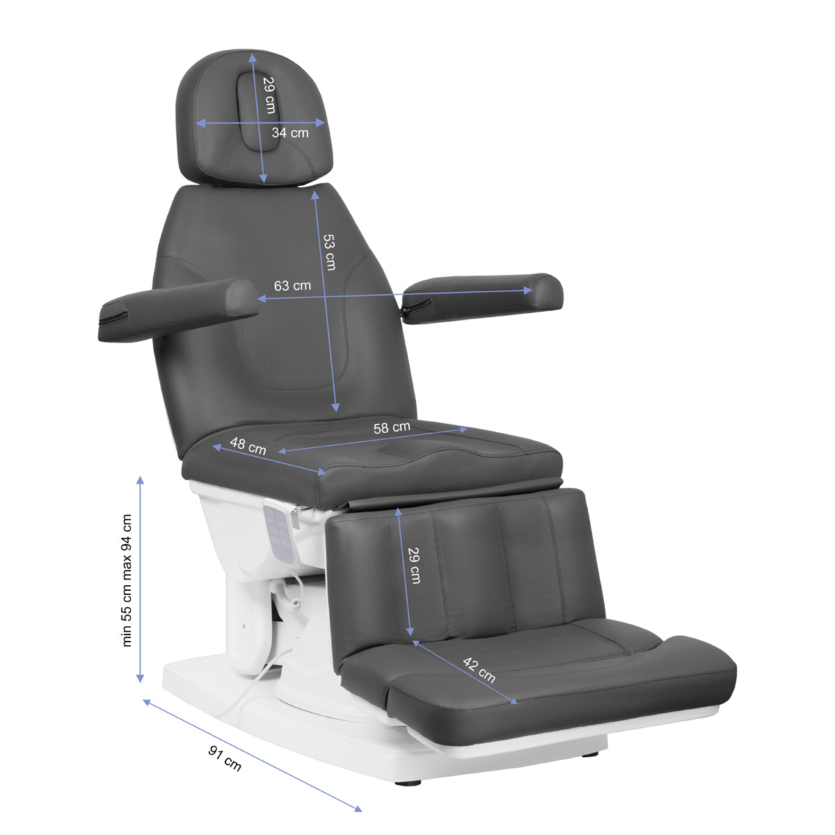 modern electrically adjustable cosmetic chair, ensuring comfort during the treatment not only for patients but also for the persons performing the procedure. 4 quiet electric motors enable quick and convenient adjustment of the chair by remote control. Optionally, it is possible to connect a foot switch, code 133026. The seats have a contoured and very comfortable seat, they are durable and very stable. the special design of the footrest facilitates pedicure and podiatry treatments. up-down adjustment range allowing for individual adjustment of the chair height to the height of the person performing the procedure and the type of treatment