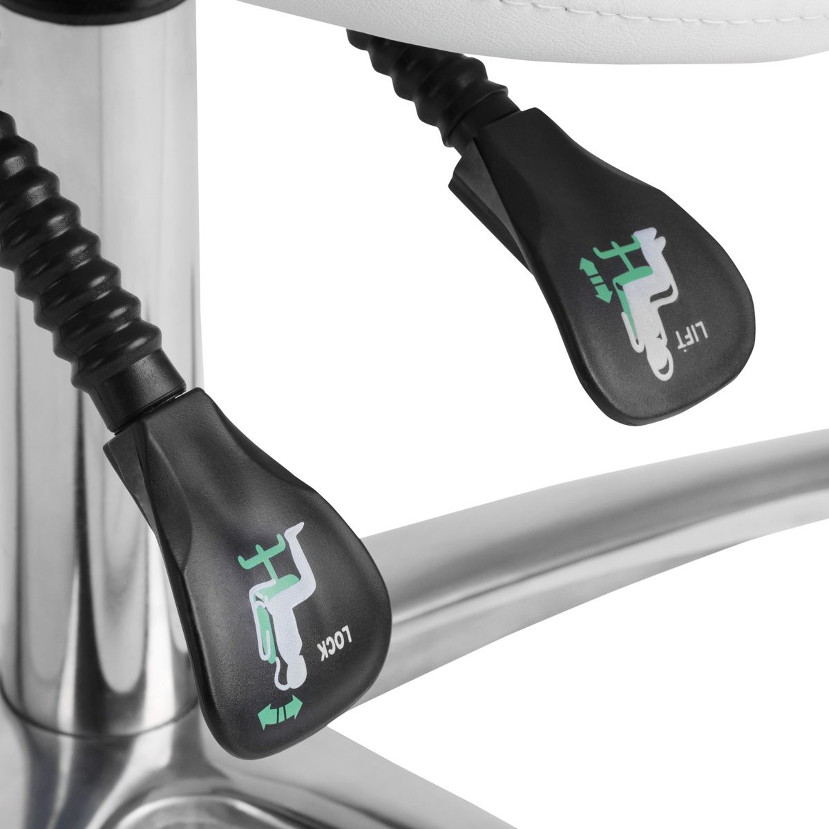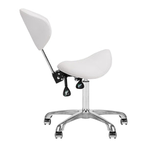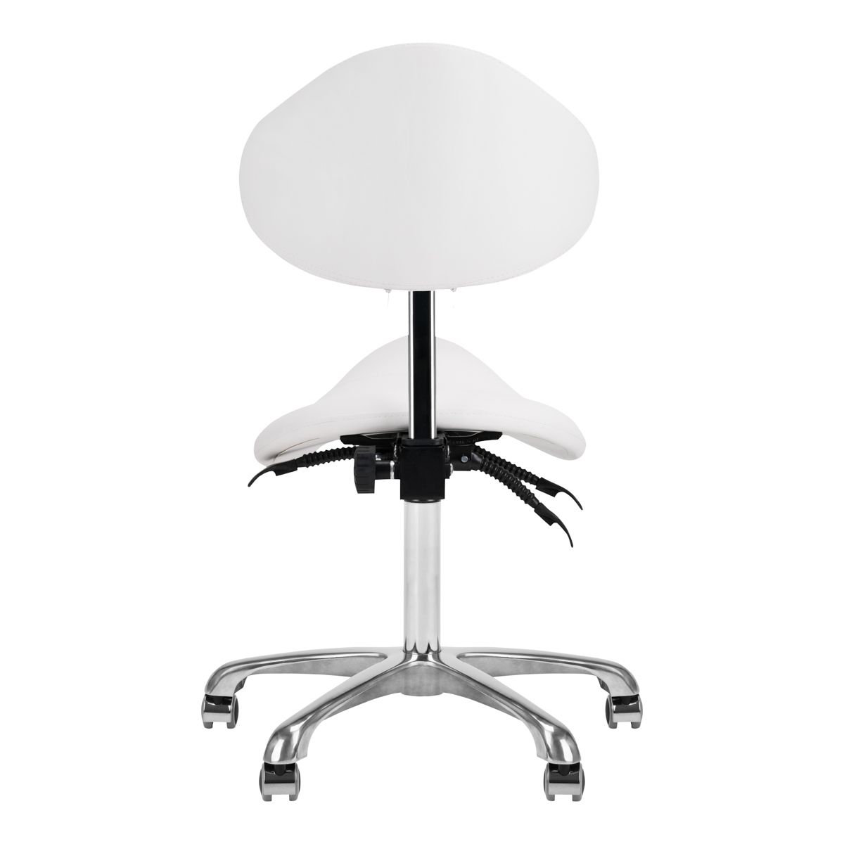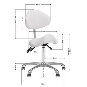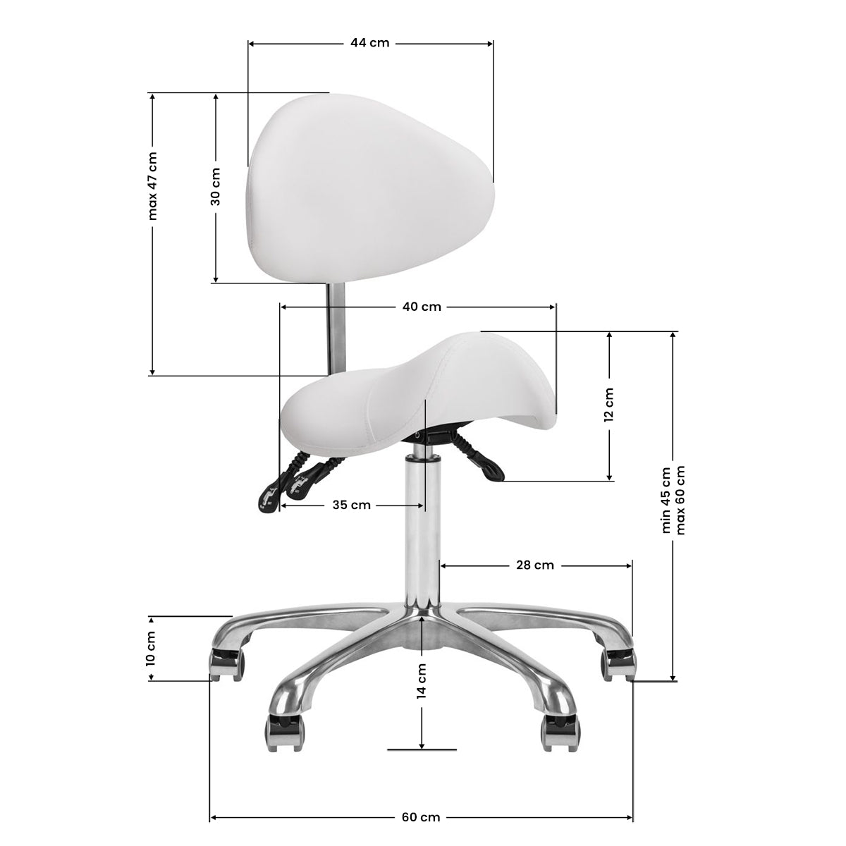 Comfortable, exclusive, stable cosmetic stool with a backrest and a profiled seat, on a five-star, very stable base. Adjustable in three planes: