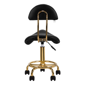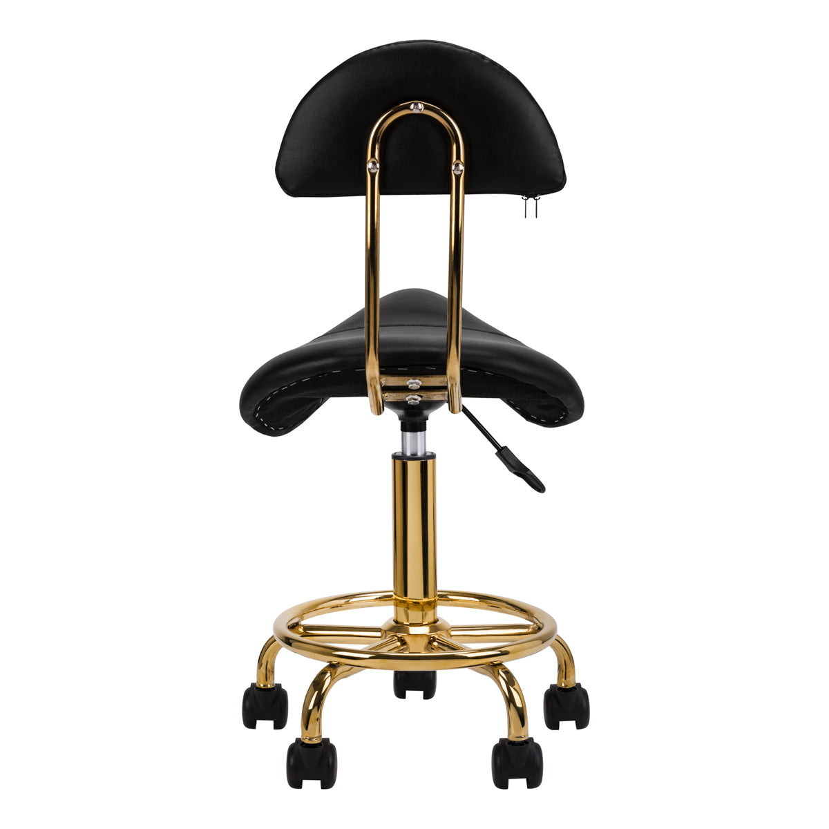 Comfortable, stable cosmetic stool with a backrest, with a profiled seat, gold-colored metal elements. On a five-star base with plastic wheels. Available in white, a necessary piece of furniture in a beauty salon. Lacquered metal surfaces.
