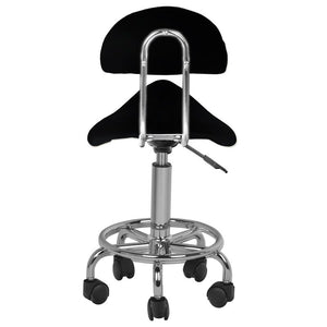 a comfortable, stable cosmetic stool with a backrest, with a profiled seat, on a five-star base with plastic wheels. available in black, a necessary piece of furniture in a beauty salon.