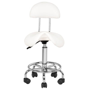 a comfortable, stable cosmetic stool with a backrest, with a profiled seat, on a five-star base with plastic wheels. available in white, a necessary piece of furniture in a beauty salon.