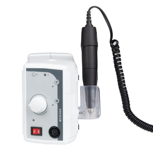 The panel located on the box has all the amenities. On / off switch in the form of a red switch (you will never forget to turn it off!). A knob that allows you to smoothly adjust the speed of the handpiece. Change of rotation to left or right. The overvoltage protection system has been included (the power will turn off and the LED will light up) - press the reset button (RE) to re-operate. You can connect a foot drive and have more hands freedom. Certainly, the silicone handpiece stand will make your work more easy. Put the nail drill on its side if that's convenient for you - it'll work just as well!