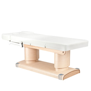 electric cosmetic bed adjustable in height in a very wide range from 64 to 82 cm. backrest, footrests also adjustable by remote control, face opening, support columns controlled independently. a wide piece of furniture (76 cm), with a thick and very comfortable and heated mattress. the bunk is very stable. it is upholstered with high-quality eco-leather in a delicate ecru shade.