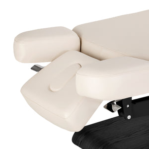 The profiled surface of the treatment lounger promotes a natural body position, providing stable and comfortable support along its entire length. The appropriate width and soft mattress increase the client's comfort, especially during longer treatments. Greater comfort means a better treatment experience and a higher standard of service in the salon. An additional arm shelf increases comfort when lying on the stomach, relieving pressure on the upper body and promoting complete relaxation.