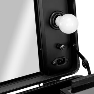 A functional cosmetic box in the form of a comfortable, portable suitcase on wheels. The perfect solution for mobile beauticians or make-up artists. Very roomy. It has four telescopic legs, thanks to which we can properly adjust the height of the station. Lighting on the sides of the mirror. Inside the trunk, there are additionally four folding shelves for small accessories. Black colour.
