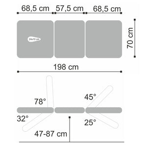 Three-section top: designed for universal application, the top measures 198 x 70 cm, with adjustment of the leg and headrest sections, allowing the patient's position to be adapted to various therapeutic procedures.