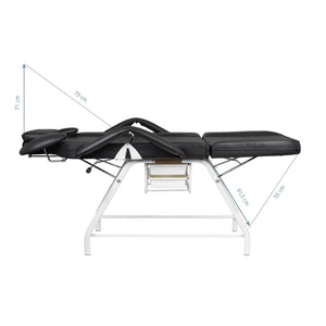 the chair has a manual adjustment of the footrest, backrest and arm support for the operator. the hand support used is an extremely practical solution not found in other armchairs. equipped with a comfortable pillow for the client and handy litter boxes for placing the necessary accessories.