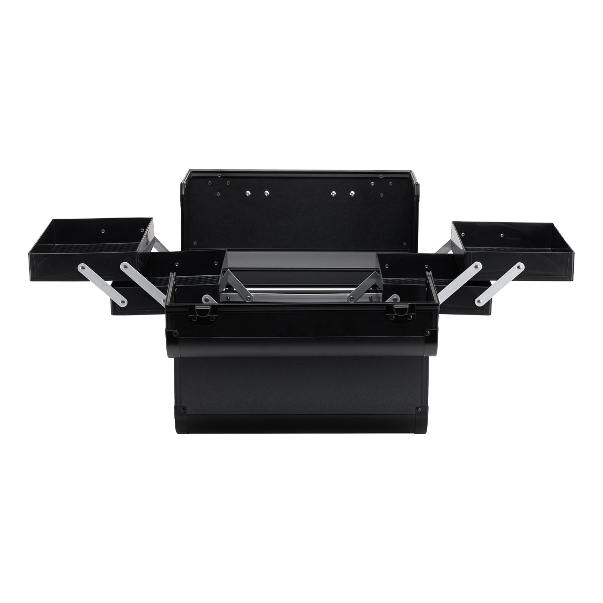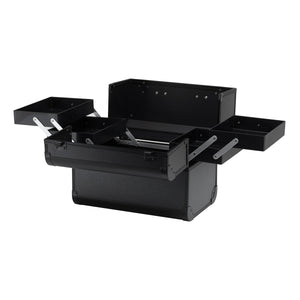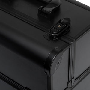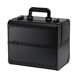 The modern design with smooth black-finished walls and metallic accents adds a touch of elegance. The handle makes transport easier, which is especially important for mobile stylists. Made from durable, damage-resistant materials, it ensures everyday comfort of use. A sturdy latch closure with a key keeps the contents protected, while the lightweight and durable structure makes the case easy to carry.