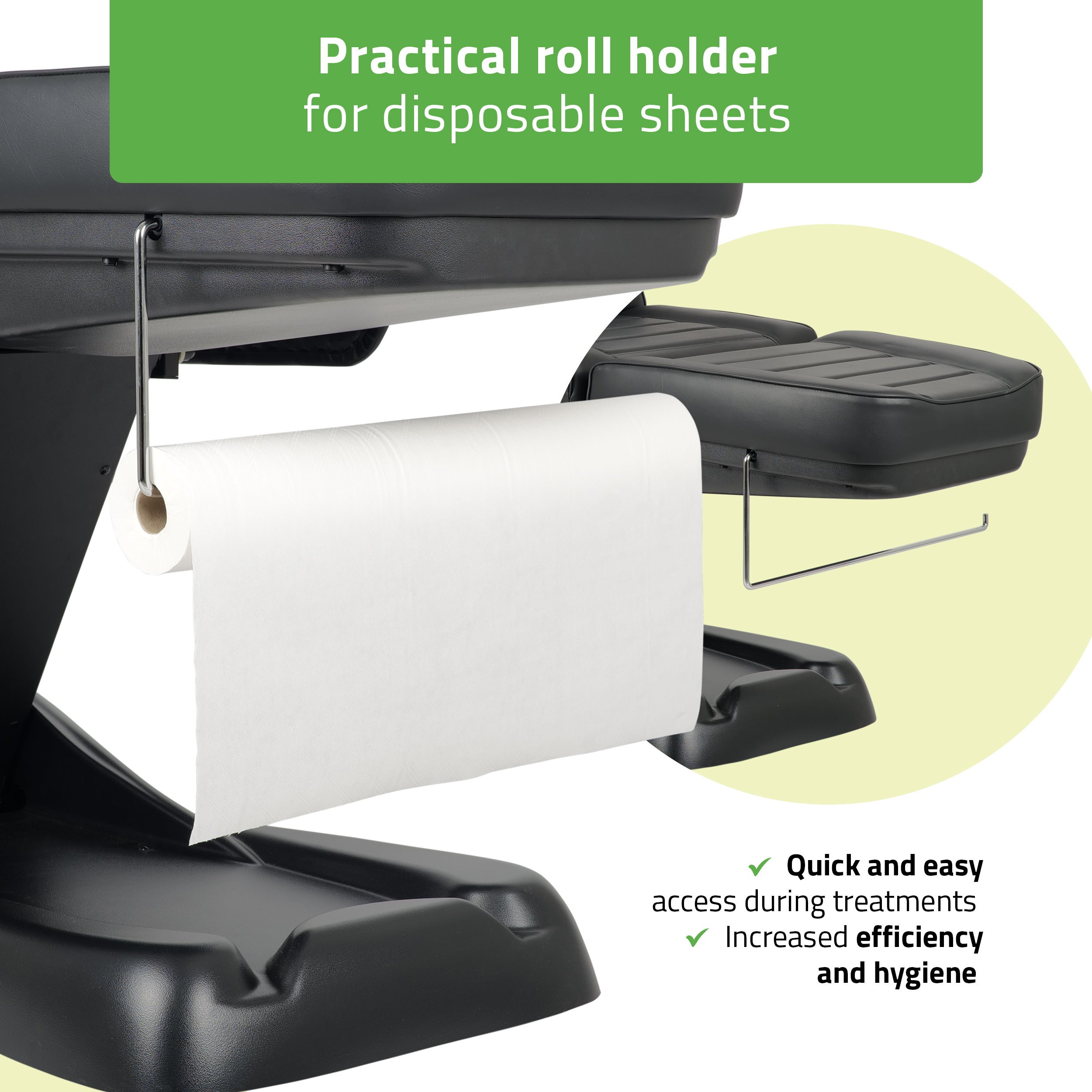 Roll paper holder: The chair features a practical holder for disposable roll paper, increasing efficiency and hygiene during treatments.