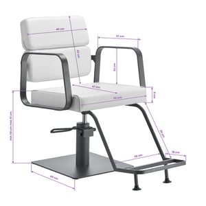 The full rotation mechanism of the chair makes the hairdresser's work more effective and comfortable. A solid, flat, square-shaped base guarantees stability during use. The matte-finished, smooth surface gives the element an elegant look and makes it easy to keep clean. A comfortable seat with foam filling ensures high comfort of use, even during many hours of treatments. Geometric, metal armrests allow for the correct positioning of the client's shoulders – this means that he does not bury his head in his shoulders or slouch – which makes it much easier to perform precise treatments, including haircuts. A stylish footrest dedicated to this model provides stable support for the user's feet.