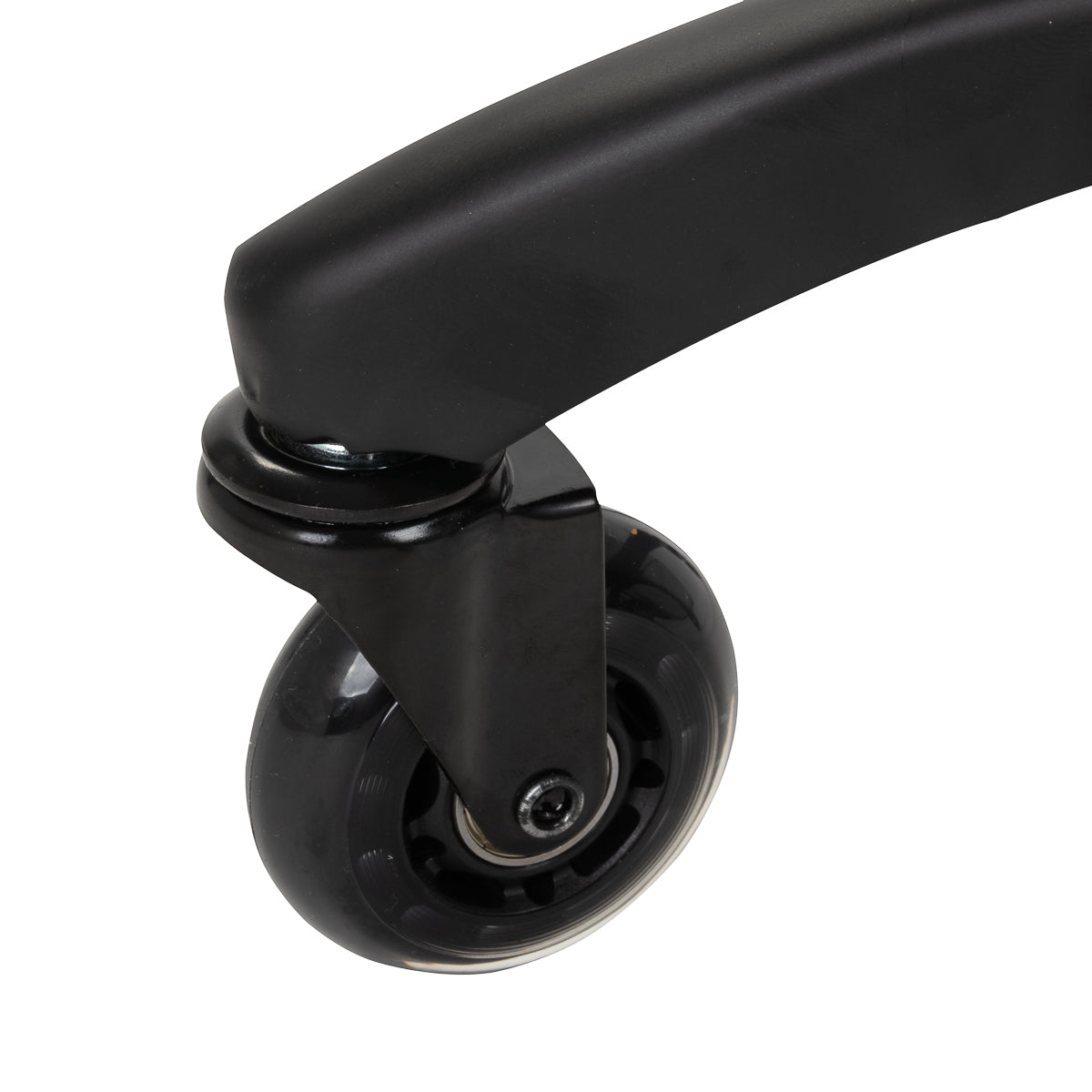 Seat height adjustment in the range of 56-77 cm allows the specialist to adjust their position while performing services. The saddle-shaped seat, filled with deformation-resistant foam, guarantees comfort and ergonomics. The full rotation mechanism makes work more efficient and convenient. Mobility is ensured by Roll Speed wheels with an iron core and polyurethane (PU) coating, which combine smooth movement with exceptional wear resistance. The use of ABEC-7 bearings makes the stool easy to move, significantly easier to manoeuvre.