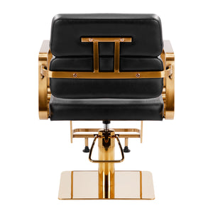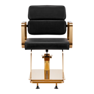 The full rotation mechanism of the chair makes the hairdresser's work more effective and comfortable. A solid, flat, square-shaped base guarantees stability during use. The matte-finished, smooth surface gives the element an elegant look and makes it easy to keep clean. A comfortable seat with foam filling ensures high comfort of use, even during many hours of treatments. Geometric, metal armrests in shades of gold allow for the correct positioning of the client's shoulders – this means that he does not bury his head in his shoulders or slouch – which makes it much easier to perform precise treatments, including haircuts. A stylish footrest dedicated to this model provides stable support for the user's feet.
