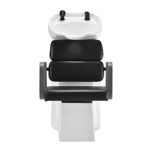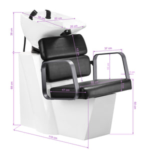 The appropriate depth of the white ceramic washbasin bowl prevents excessive splashing of water or products used during treatments. This allows for comfortable and effective performance of a wide range of services. The angle of the bowl can be adjusted, making it easy to adapt to individual needs. The high quality of the materials used makes the washbasin durable, resistant to discoloration and scratches, and very easy to clean. A properly profiled collar and inclined backrest provide support and comfort when washing the hair, and thanks to the comfortable black plastic overlay, the customer will not feel the unpleasantness of the cold ceramic surface.