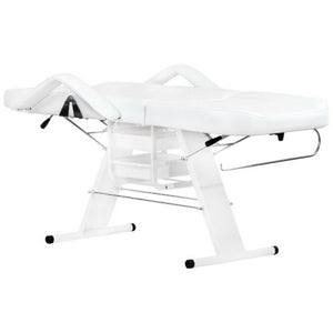 armchair with a hole in the headrest, with practical litter boxes, is perfect for cosmetics, make-up and massage. it has removable armrests and a plug in the headrest. Easily washable seat cover, made of eco-leather, meeting the stringent EU requirements, aesthetic, nickel-plated metal elements. on the backrest there is a bow for a disposable sheet, tablecloths or a towel. The armchair is available in white. The armchair consists of: