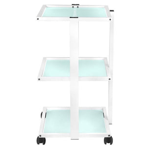 aesthetic table for cosmetic devices, made of metal and glass, with rubberized wheels. it has three glass shelves with an engraved giovanni logo. it is possible to attach a magnifying lamp to it.
