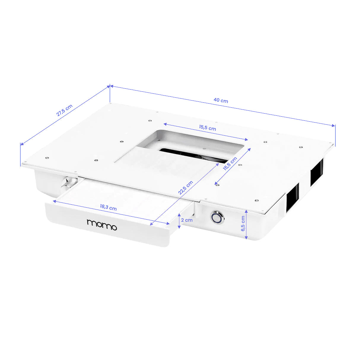 The Momo J-02 cassette dust collector built into the countertop significantly improves the comfort and hygiene of work, effectively removing dust generated during beauty treatments, such as manicures. Thanks to this device, the air in the salon remains clean and the workplace free from pollution, which increases the safety of both the beautician and clients. The dust collector is easy to use and maintain, which additionally enhances its functionality. Regular cleaning and filter replacement ensure consistently high absorption efficiency. It is possible to purchase additional replacement filters (SKU 123581). An activated carbon filter (SKU 123582) is also available in our store, which effectively eliminates allergens and microorganisms, improving the level of hygiene in the salon.