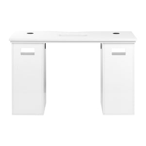 Skabe på begge sider med tre rummelige skuffer letter organiseringen og hjælper med at holde orden i dine mest nødvendige kosmetik og værktøjer. Som et resultat er alt, hvad du har brug for, altid lige ved hånden, hvilket fremmer et smidigt og effektivt arbejde. Åbne hylder lige over skufferne giver ekstra plads - ideel til apparater eller ofte brugte genstande. Skrivebordet er udstyret med specielle åbninger og kabelgennemføringer, der gør det muligt at føre kabler fra enheder æstetisk og pænt.