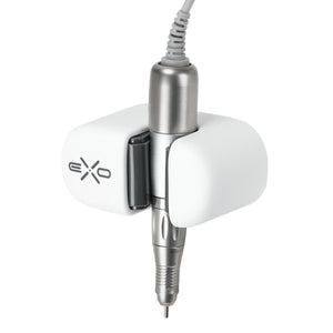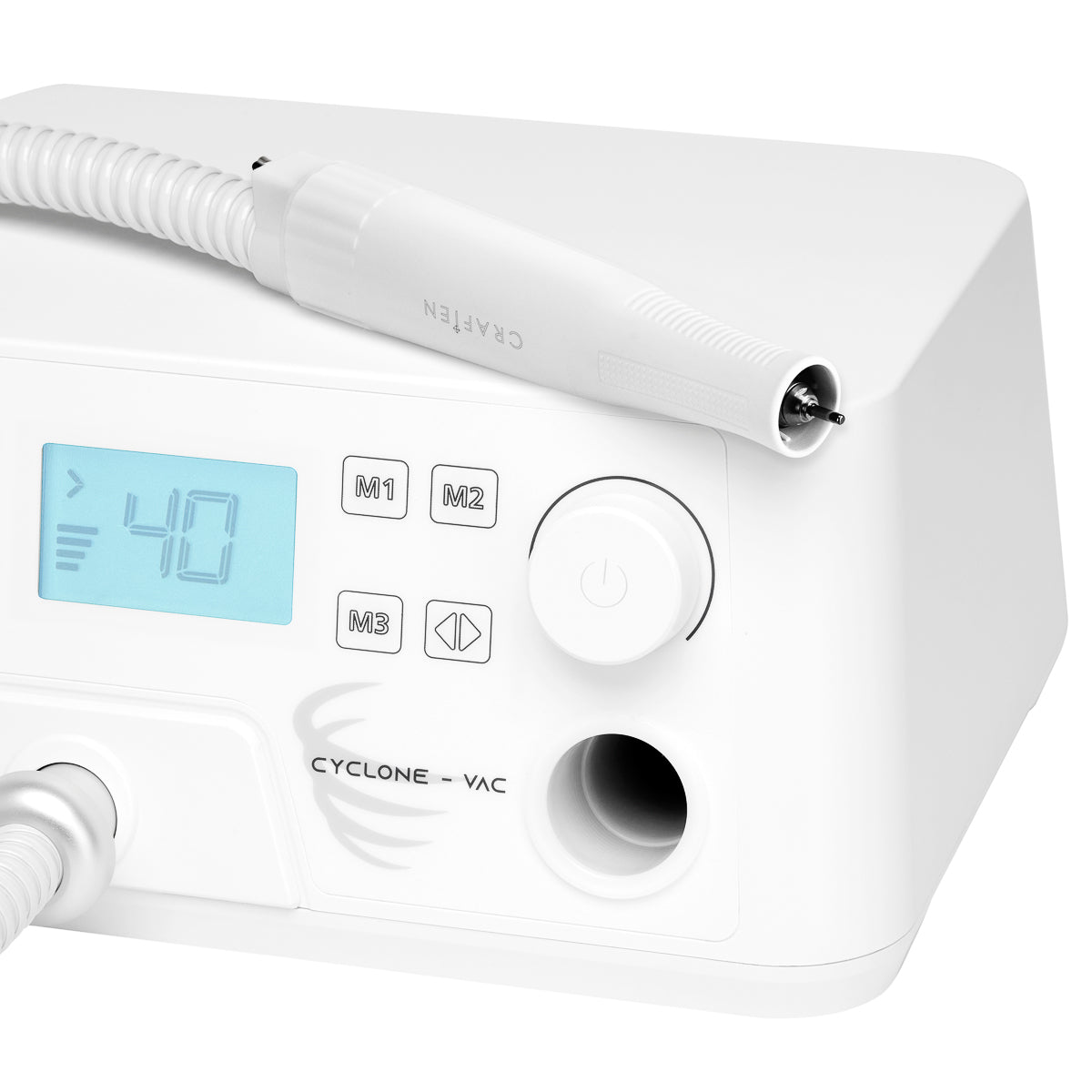 Det stille, ergonomiske håndstykke med børsteløs motor og et justerbart hastighedsområde på 4.000 – 40.000 omdr./min. med en effektiv absorber garanterer fremragende servicekvalitet og opretholdelse af de højeste hygiejnestandarder, der beskytter lungerne hos både behandlere og klienter. Støv fra behandlingsområdet suges gennem hullerne i håndstykket direkte ind i filteret. ON/OFF-kontakten placeret på bagsiden af håndtaget giver dig mulighed for nemt midlertidigt at stoppe rotationen og sugningen under drift. Dette letter fri betjening af apparatet til enhver tid under behandlingen. Udskiftning af fræsere er let, hvilket sikres af Push-in & Pull-out-mekanismen, der anvendes – bare skub fræseren ind i muffen, uden at skrue eller låse den – og det lettes desuden af værktøjet, der er inkluderet i sættet. Håndstykket kan let skilles ad for nem rengøring. De anvendte løsninger forhindrer overdreven håndtræthed og understøtter komfortabelt og sikkert arbejde.