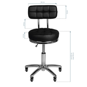 sort kosmetisk skammel med et quiltet sæde og et behageligt ryglæn. den er højdejusterbar, og den armlignende base er udstyret med solide metal-gummihjul.