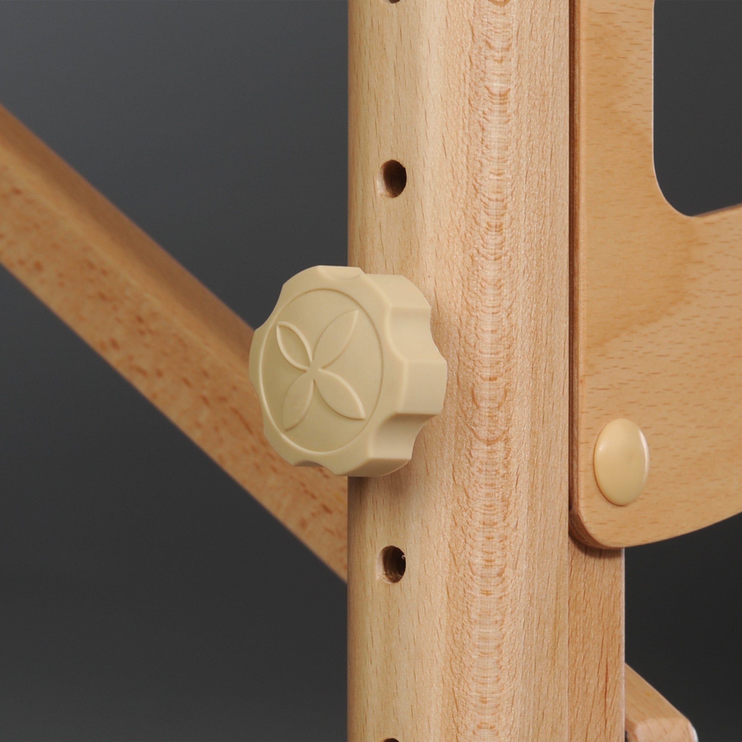 komfortabel justeringsknap i gummi signeret med Habys-logoet, med et ekstra lag filt, der beskytter træelementerne