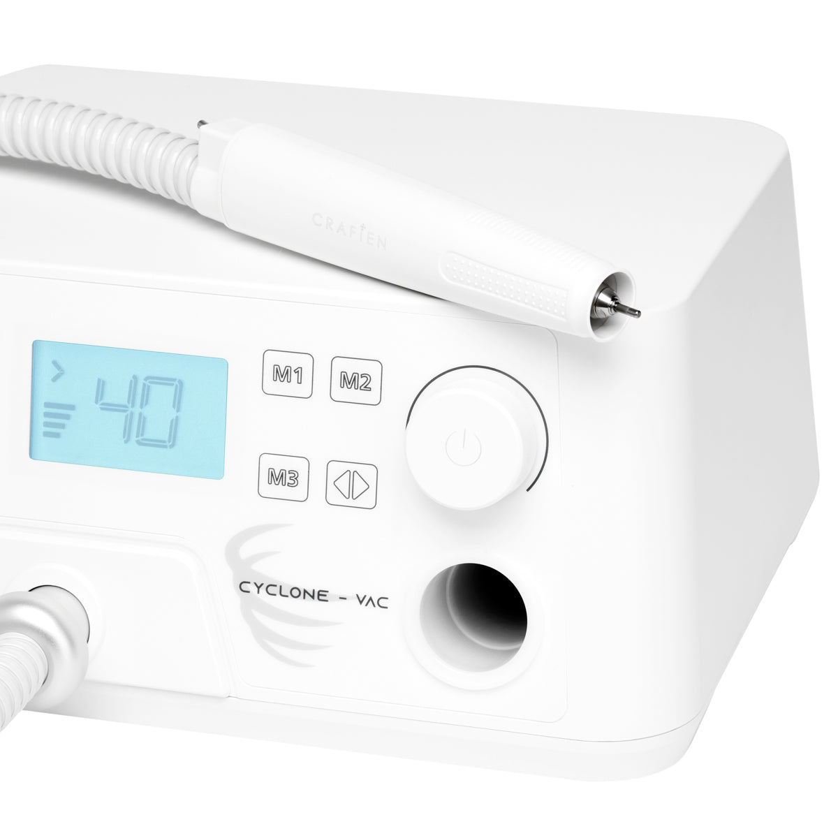 Det støjsvage, ergonomiske hoved med børsteløs motor og et justerbart hastighedsområde på 4.000 – 40.000 omdr./min. med en effektiv opsamler garanterer fremragende servicekvalitet og opretholdelse af de højeste hygiejnestandarder, der beskytter lungerne hos både behandlere og klienter. Støv fra behandlingsområdet suges gennem hullerne i hovedet direkte ind i filteret. ON/OFF-kontakten placeret på bagsiden af håndtaget giver dig mulighed for nemt midlertidigt at stoppe rotation og sug under drift. Dette letter fri betjening af apparatet til enhver tid under behandlingen. Udskiftning af fræsere er let, hvilket sikres af Push-in & Pull-out-mekanismen, der anvendes – bare skub fræseren ind i muffen, uden at skrue eller låse den – og det lettes yderligere af værktøjet, der er inkluderet i sættet. Hovedet kan let skilles ad for nem rengøring. De anvendte løsninger forhindrer overdreven håndtræthed og understøtter behageligt og sikkert arbejde.
